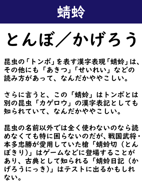 昆虫の「トンボ」を表す漢字表現「蜻蛉」は、その他にも「あきつ」「せいれい」などの読み方があって、なんだかややこしい。さらに言うと、この「蜻蛉」はトンボとは別の昆虫「カゲロウ」の漢字表記としても知られていて、なんだかややこしい。昆虫の名前以外では全く使わないのなら読めなくても特に困らないのだが、戦国武将・本多忠勝が愛用していた槍「蜻蛉切(とんぼきり)」はゲームなどに登場することがあり、古典として知られる「蜻蛉日記(かげろうにっき)」はテストに出るかもしれない。