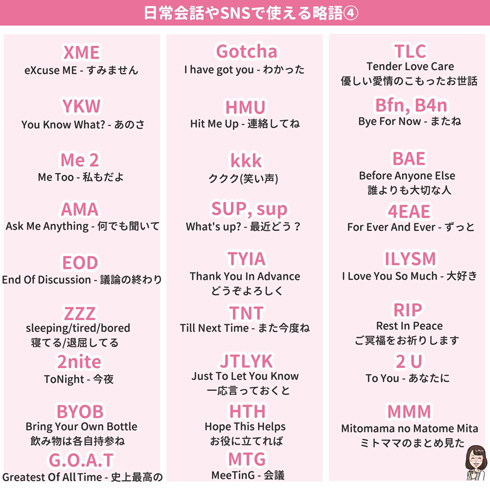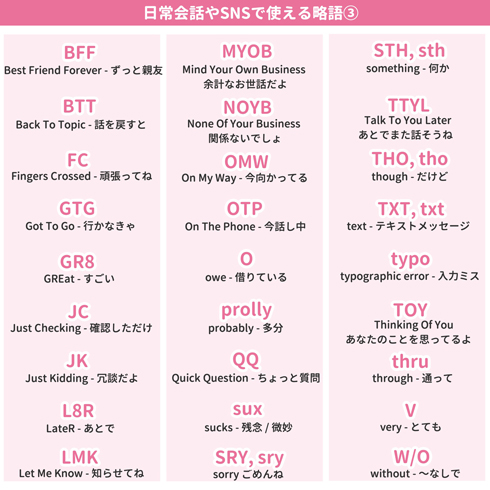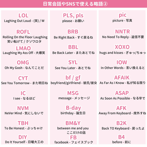 「日常会話やSNSで使える略語」として、100以上もの言葉を紹介。「zzz」(寝てる)、「RIP」(ご冥福をお祈りします)のように、すでに日本でも違和感なく使われているものあれば、「XME」(excuse meの略)、「GR8」(greatの略)、「NNTR」(返信不要)のように全くなじみのなさそうな言葉もちらほら。