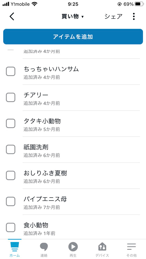 家などに設置したAmazon製のスマートスピーカーに向かって「アレクサ、〇〇を買い物リストに追加して」と呼びかけることで、一切スマートフォンに触らず買い物リストを作ることができます。