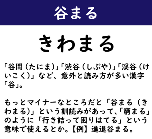 「谷間(たにま)」「渋谷(しぶや)」「渓谷(けいこく)」など、意外と読み方が多い漢字「谷」。もっとマイナーなところだと「谷まる(きわまる)」という訓読みがあって、「窮まる」のように「行き詰って困りはてる」という意味で使えるとか。【例】進退谷まる。