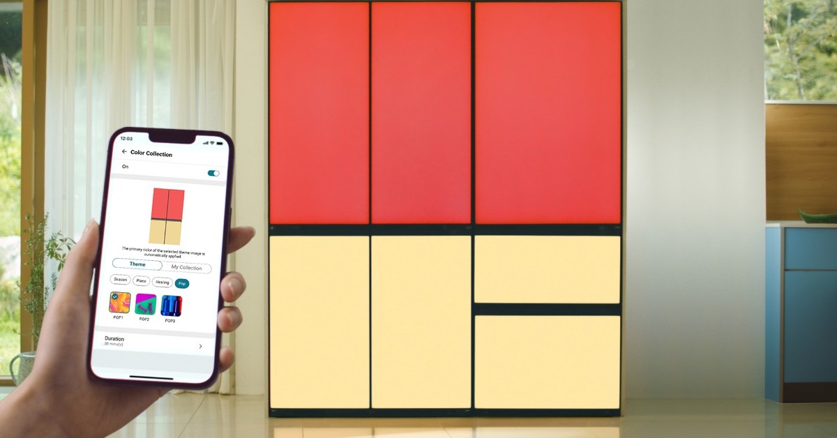 LEDパネルは冷蔵庫のドアに搭載されており、LGのアプリ「LG ThinQ」を使って、上部のパネルは22色、下部のパネルは19色から選択可能。季節を反映する「Season」、ソフトなカラーの「Mood」などさまざまなカラーテーマも用意されています。