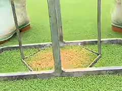 芝生の変色してしまった一部を切り抜いて、植え替える整備作業。六角形に芝を切り抜いて取り出し、そこに土を入れて高さを整えてから、新しい六角形の芝を埋め込みます。何度か叩いてしっかりとはめ込んでから、周りの芝とのつなぎ目に砂と水をかけてなじませます。