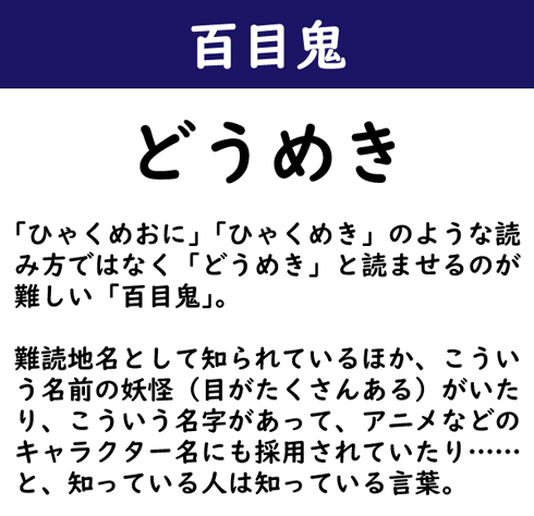 「ひゃくめおに」「ひゃくめき」のような読み方ではなく「どうめき」と読ませるのが難しい「百目鬼」。難読地名として知られているほか、こういう名前の妖怪(目がたくさんある)がいたり、こういう名字があって、アニメなどのキャラクター名にも採用されていたり……と、知っている人は知っている言葉。