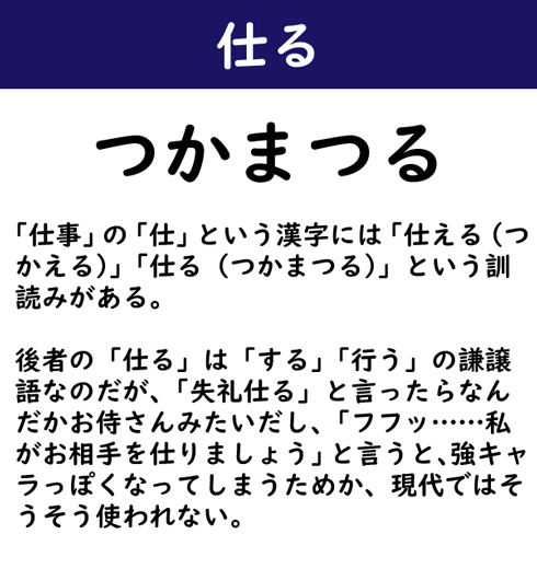 「仕事」の「仕」という漢字には「仕える(つかえる)」「仕る(つかまつる)」という訓読みがある。後者の「仕る」は「する」「行う」の謙譲語なのだが、「失礼仕る」と言ったらなんだかお侍さんみたいだし、「フフッ……私がお相手を仕りましょう」と言うと、強キャラっぽくなってしまうためか、現代ではそうそう使われない。