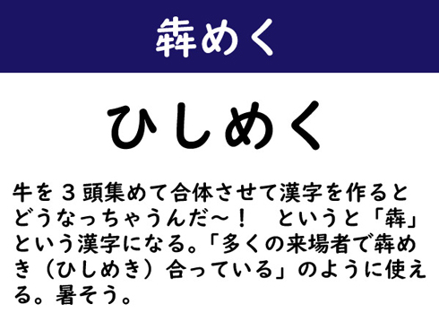 牛を3頭集めて合体させて漢字を作るとどうなっちゃうんだ〜! というと「犇」という漢字になる。「多くの来場者で犇めき(ひしめき)合っている」のように使える。暑そう。
