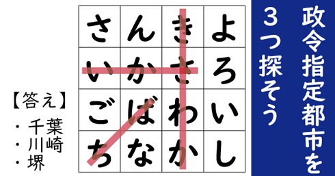 並んだひらがなの中に、政令指定都市の名前が隠れています。