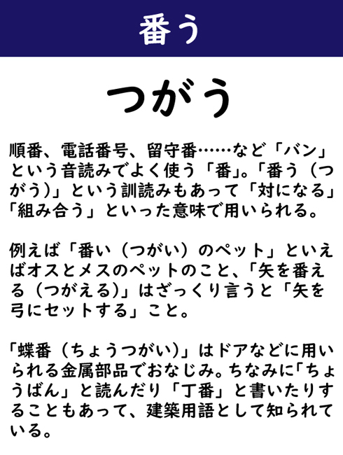 順番、電話番号、留守番……など「バン」という音読みでよく使う「番」。「番う(つがう)」という訓読みもあって「対になる」「組み合う」といった意味で用いられる。例えば「番い(つがい)のペット」といえばオスとメスのペットのこと、「矢を番える(つがえる)」はざっくり言うと「矢を弓にセットする」こと。「蝶番(ちょうつがい)」はドアなどに用いられる金属部品でおなじみ。ちなみに「ちょうばん」と読んだり「丁番」と書いたりすることもあって、建築用語として知られている。