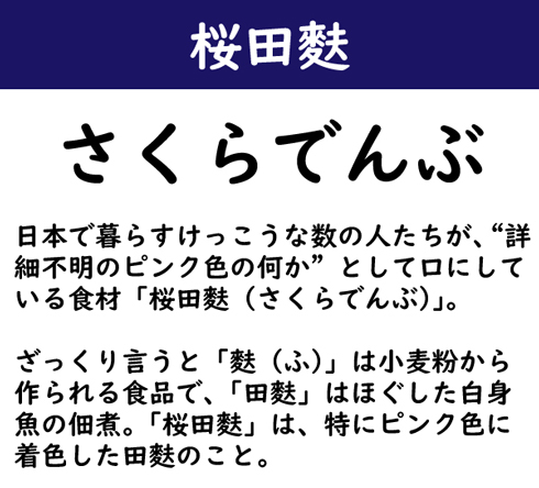 日本で暮らすけっこうな数の人たちが、“詳細不明のピンク色の何か”として口にしている食材「桜田麩(さくらでんぶ)」。ざっくり言うと「麩(ふ)」は小麦粉から作られる食品で、「田麩」はほぐした白身魚の佃煮。「桜田麩」は、特にピンク色に着色した田麩のこと。