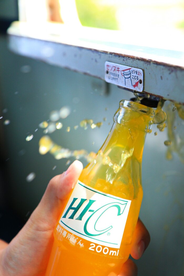 懐かしい車内で、これまた懐かしい雰囲気の「HI‐Cオレンジ」を持つchibaさん。フタを開けようと栓抜きを使用した瞬間をとらえた画像は、ほとばしるオレンジジュースに躍動感があり、まるでジュースのポスターやCMのような雰囲気に。