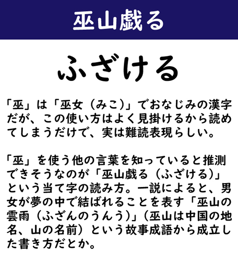 「巫」は「巫女(みこ)」でおなじみの漢字だが、この使い方はよく見掛けるから読めてしまうだけで、実は難読表現らしい。「巫」を使う他の言葉を知っていると推測できそうなのが「巫山戯る(ふざける)」という当て字の読み方。一説によると、男女が夢の中で結ばれることを表す「巫山の雲雨(ふざんのうんう)」(巫山は中国の地名、山の名前)という故事成語から成立した書き方だとか。