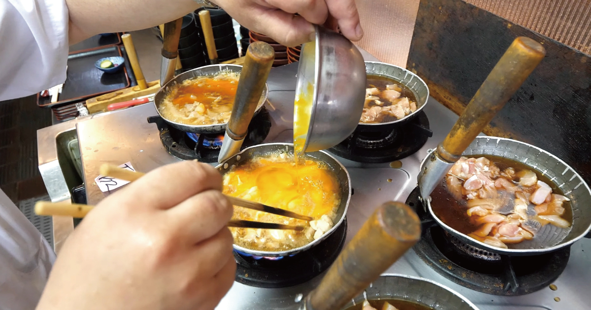 ゆったりと食事を楽しむ客席とは対照的に、7つのコンロはフル稼働。注文が入るタイミングは全て重なるわけではないので、それぞれ火の通り具合が異なる親子鍋を自在に操り、卵が固まりきらない絶妙なタイミングで具材をご飯に乗せていきます。