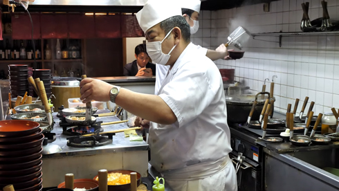 忙しい厨房の様子。コンロと逆側のスペースにも親子鍋がぎっしり(YouTubeより)