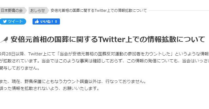 日本野鳥の会は9月29日、「安倍元総理の国葬反対運動の参加者を日本野鳥の会が数えた」とする情報がTwitterで拡散していることについて、このような事実は確認していないと否定しました。