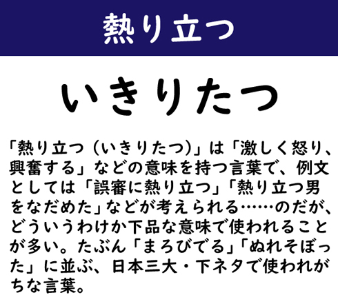 「熱り立つ(いきりたつ)」は「激しく怒り、興奮する」などの意味を持つ言葉で、例文としては「誤審に熱り立つ」「熱り立つ男をなだめた」などが考えられる……のだが、どういうわけか下品な意味で使われることが多い。たぶん「まろびでる」「ぬれそぼった」に並ぶ、日本三大・下ネタで使われがちな言葉。