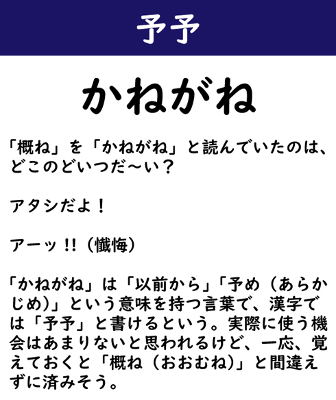 「概ね」を「かねがね」と読んでいたのは、どこのどいつだ〜い? アタシだよ! アーッ!!(懴悔) 「かねがね」は「以前から」「予め(あらかじめ)」という意味を持つ言葉で、漢字では「予予」と書けるという。実際に使う機会はあまりないと思われるけど、一応、覚えておくと「概ね(おおむね)」と間違えずに済みそう。