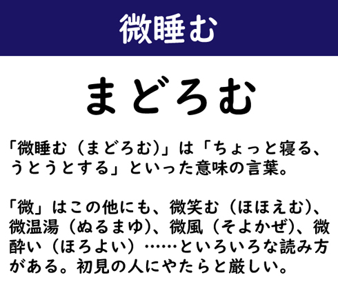 「微睡む(まどろむ)」は「ちょっと寝る、うとうとする」といった意味の言葉。「微」はこの他にも、微笑む(ほほえむ)、微温湯(ぬるまゆ)、微風(そよかぜ)、微酔い(ほろよい)……といろいろな読み方がある。初見の人にやたらと厳しい。