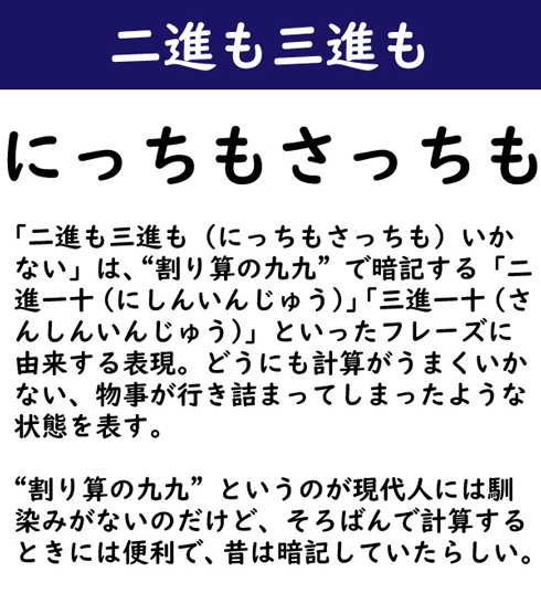 「二進も三進も(にっちもさっちも)いかない」は、“割り算の九九”で暗記する「二進一十(にしんいんじゅう)」「三進一十(さんしんいんじゅう)」といったフレーズに由来する表現。どうにも計算がうまくいかない、物事が行き詰まってしまったような状態を表す。“割り算の九九”というのが現代人には馴染みがないのだけど、そろばんで計算するときには便利で、昔は暗記していたらしい。