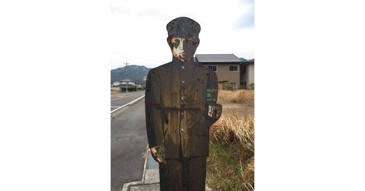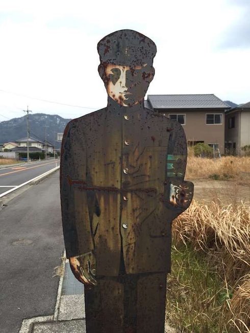ken(@ken29716939)さんが投稿したのは、詰襟の服を着た学生らしき人物の立て看板。しかしさびなどの経年変化によってその姿はおどろおどろしいものとなっており、まさに昭和のホラー作品に出てきそうなすごみを漂わせています。もとは交通安全の看板だったようですが、今やむしろ道行く人を仰天させてしまいそうな見た目……。