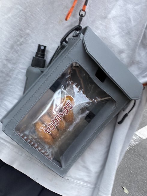 投稿者はサブ会場(@ktzgw)さん。身に着けているのは透明なポケット付きのシンプルなミニバッグですが、その中にはなぜか懐かしの駄菓子「ヤングドーナツ」が。まるで遠足へ向かう子どものようなワクワク感の漂うスタイルは、道行く人の視線を集めることができそうです。