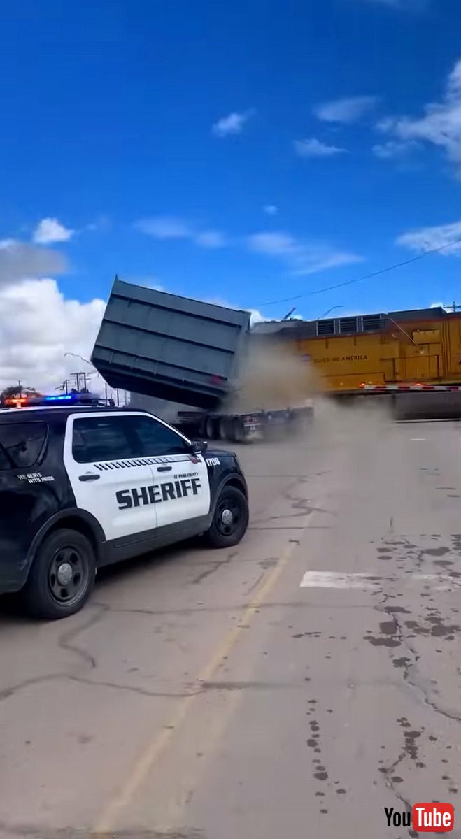 轟音と共にぶつかった衝撃で荷台は破壊され、頑丈なコンテナも盛大に吹き飛ばされました。衝突の勢いでコンテナは回転し、土煙を上げながら横倒しになり、衝撃の大きさを物語っています。幸いなことに事故による負傷者は出ていないそうです。
