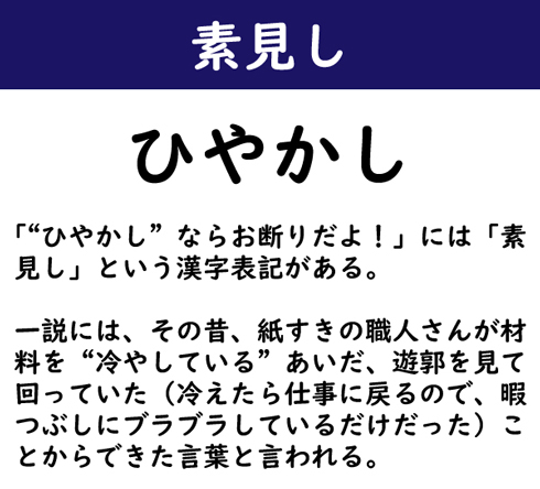 「“ひやかし”ならお断りだよ!」には「素見し」という漢字表記がある。一説には、その昔、紙すきの職人さんが材料を“冷やしている”あいだ、遊郭を見て回っていた(冷えたら仕事に戻るので、暇つぶしにブラブラしているだけだった)ことからできた言葉と言われる。