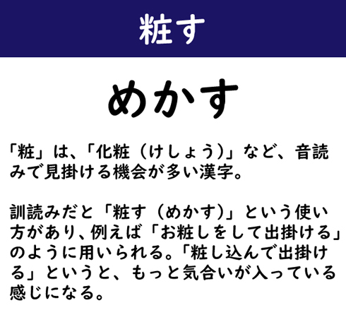 「粧」は、「化粧(けしょう)」など、音読みで見掛ける機会が多い漢字。訓読みだと「粧す(めかす)」という使い方があり、例えば「お粧しをして出掛ける」のように用いられる。「粧し込んで出掛ける」というと、もっと気合いが入っている感じになる。