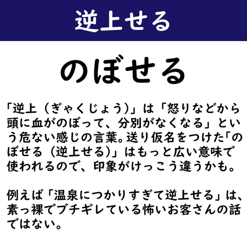 「逆上(ぎゃくじょう)」は「怒りなどから頭に血がのぼって、分別がなくなる」という危ない感じの言葉。送り仮名をつけた「のぼせる(逆上せる)」はもっと広い意味で使われるので、印象がけっこう違うかも。例えば「温泉につかりすぎて逆上せる」は、素っ裸でブチギレている怖いお客さんの話ではない。