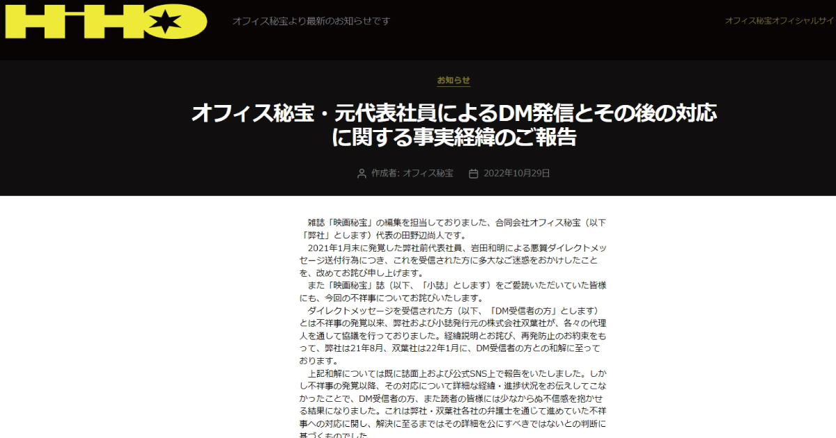 同記事によると、オフィス秘宝は『映画秘宝』の刊行継続のために、岩田氏、田野辺氏の両名によって設立された合同会社。田野辺氏がうつ病など健康面でのトラブルを抱える一方で、「岩田氏の専横」が常態化し「岩田氏と私、フリー編集スタッフの間には、それぞれ確執」があったとしています。