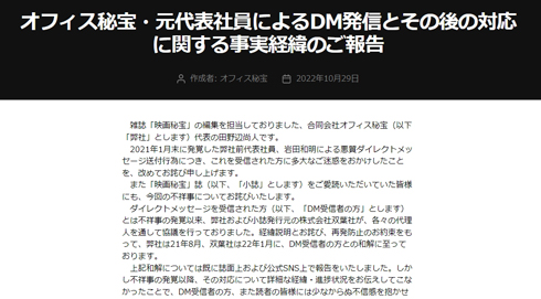 2021年1月、雑誌『映画秘宝』で起こった「同誌に批判的な意見を述べた個人に対し、雑誌の公式Twitterアカウントから“恫喝的発言”がDM(ダイレクトメッセージ)が送付される」というトラブル。この件について「発覚から現在までの経緯」を説明する文書が、同誌の制作を手掛けていたオフィス秘宝のブログ上で公開されました。
