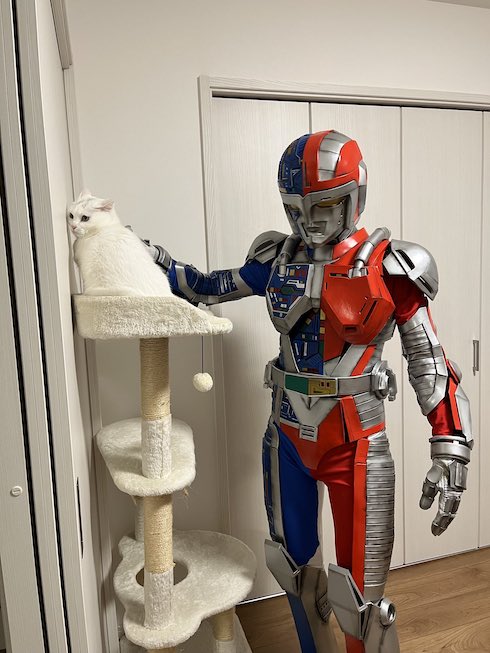 投稿者のアクト(@AktFall)さんが扮しているのは、1987年に放送された特撮番組「超人機メタルダー」の主人公であるメタルダー。細部まで忠実に再現された、本物さながらのクオリティーの高いコスプレです。しかしそのリアルさゆえか、一緒に暮らしている猫ちゃんをおびえさせてしまう事態に……。堂々たる佇まいのメタルダーと、明らかに拒絶の表情を浮かべた猫ちゃんの対比が笑いを誘います。