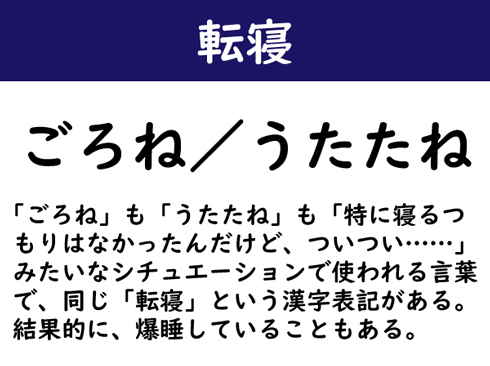 「ごろね」も「うたたね」も「特に寝るつもりはなかったんだけど、ついつい……」みたいなシチュエーションで使われる言葉で、同じ「転寝」という漢字表記がある。結果的に、爆睡していることもある。