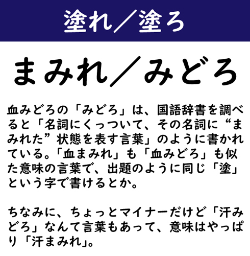 血みどろの「みどろ」は、国語辞書を調べると「名詞にくっついて、その名詞に“まみれた”状態を表す言葉」のように書かれている。「血まみれ」も「血みどろ」も似た意味の言葉で、出題のように同じ「塗」という字で書けるとか。ちなみに、ちょっとマイナーだけど「汗みどろ」なんて言葉もあって、意味はやっぱり「汗まみれ」。