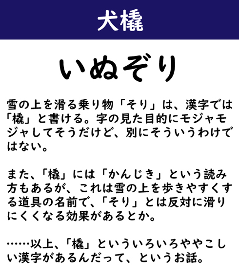 雪の上を滑る乗り物「そり」は、漢字では「橇」と書ける。字の見た目的にモジャモジャしてそうだけど、別にそういうわけではない。また、「橇」には「かんじき」という読み方もあるが、これは雪の上を歩きやすくする道具の名前で、「そり」とは反対に滑りにくくなる効果があるとか。……以上、「橇」といういろいろややこしい漢字があるんだって、というお話。
