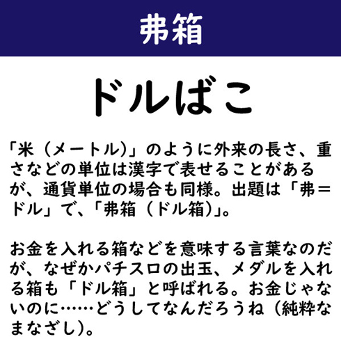 「米(メートル)」のように外来の長さ、重さなどの単位は漢字で表せることがあるが、通貨単位の場合も同様。出題は「弗=ドル」で、「弗箱(ドル箱)」。お金を入れる箱などを意味する言葉なのだが、なぜかパチスロの出玉、メダルを入れる箱も「ドル箱」と呼ばれる。お金じゃないのに……どうしてなんだろうね(純粋なまなざし)。
