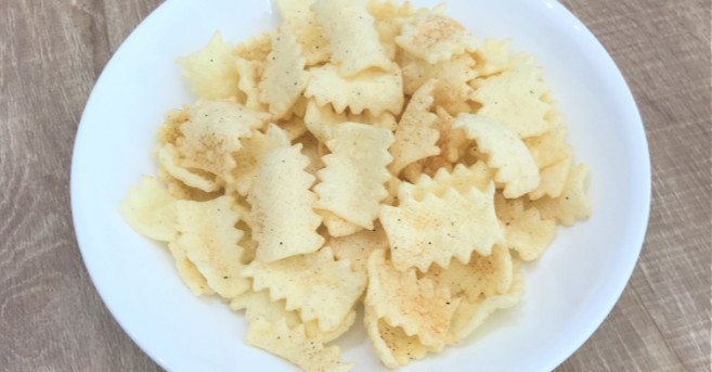 フレーバーはじゃがいもと相性のいいベーコン。生地表面に小さなくぼみを作ることで味付けパウダーをキャッチし、“ふわっとシャクシャク”なのに濃厚な味わいを実現していると述べています。