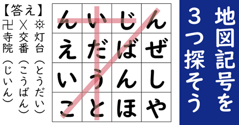 答え:灯台(とうだい)、交番(こうばん)、寺院(じいん)