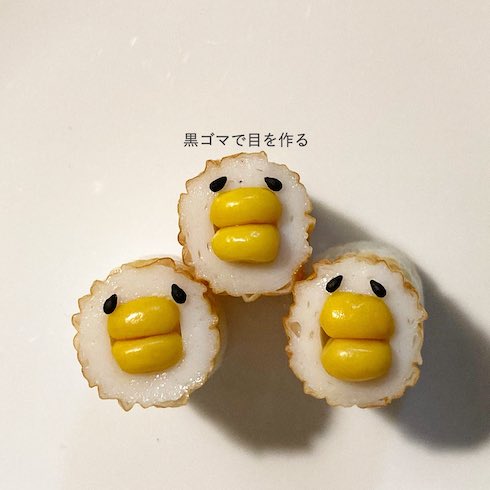 投稿者は奈(@florid_switch)さん。キュートな見た目で誰でも簡単に作れる「ぴよちくわ」は、カットしたちくわの穴にコーンを2つ詰めて、黒ゴマとケチャップで顔をあしらったら出来上がり、という料理初心者にも忙しい人にもうってつけなお弁当のおかず。