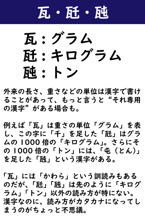 外来の長さ、重さなどの単位は漢字で書けることがあって、もっと言うと“それ専用の漢字”がある場合も。例えば「瓦」は重さの単位「グラム」を表し、この字に「千」を足した「瓩」はグラムの1000倍の「キログラム」。さらにその1000倍の「トン」には、「屯(とん)」を足した「瓲」という漢字がある。「瓦」には「かわら」という訓読みもあるのだが、「瓩」「瓲」は先のように「キログラム」「トン」以外の読み方が特にない。漢字なのに、読み方がカタカナになってしまうのがちょっと不思議。