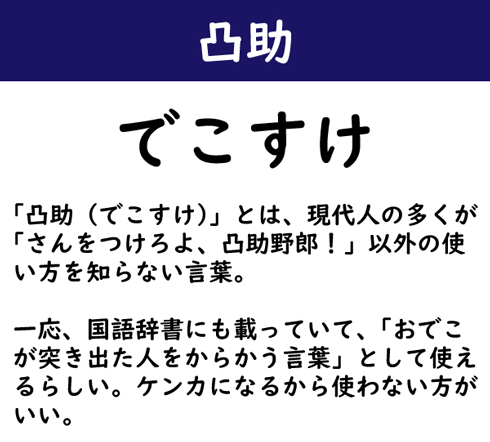 「凸助(でこすけ)」とは、現代人の多くが「さんをつけろよ、凸助野郎!」以外の使い方を知らない言葉。一応、国語辞書にも載っていて、「おでこが突き出た人をからかう言葉」として使えるらしい。ケンカになるから使わない方がいい。