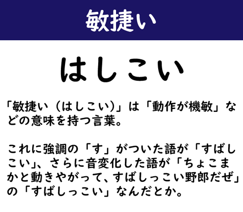 「敏捷い(はしこい)」は「動作が機敏」などの意味を持つ言葉。これに強調の「す」がついた語が「すばしこい」、さらに音変化した語が「ちょこまかと動きやがって、すばしっこい野郎だぜ」の「すばしっこい」なんだとか。