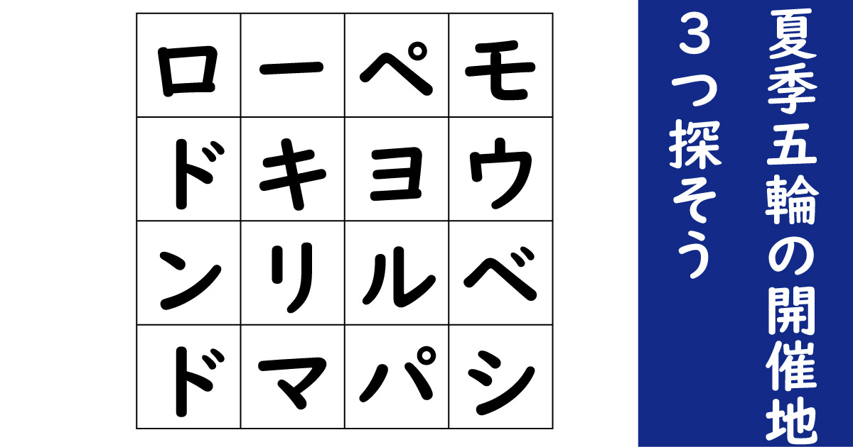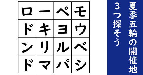 盤面に隠された「夏季五輪の開催地」を3つ探そう【言葉探しパズル】