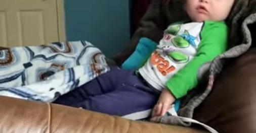動画は米バージニア州で撮影されたもの。映っている男の子は、お昼寝から目覚めたばかりで、大きな椅子の上で目をこすっています。