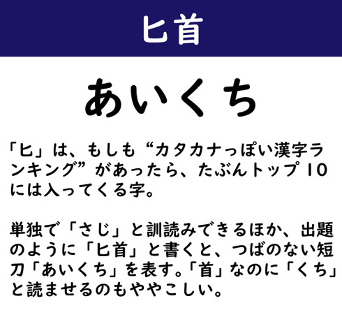 「匕」は、もしも“カタカナっぽい漢字ランキング”があったら、たぶんトップ10には入ってくる字。単独で「さじ」と訓読みできるほか、出題のように「匕首」と書くと、つばのない短刀「あいくち」を表す。「首」なのに「くち」と読ませるのもややこしい。