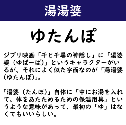 ジブリ映画「千と千尋の神隠し」に「湯婆婆(ゆばーば)」というキャラクターがいるが、それによく似た字面なのが「湯湯婆(ゆたんぽ)」。「湯婆(たんぽ)」自体に「中にお湯を入れて、体をあたためるための保温用具」というような意味があって、最初の「ゆ」はなくてもいいらしい。