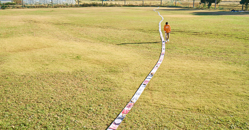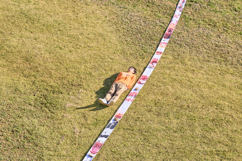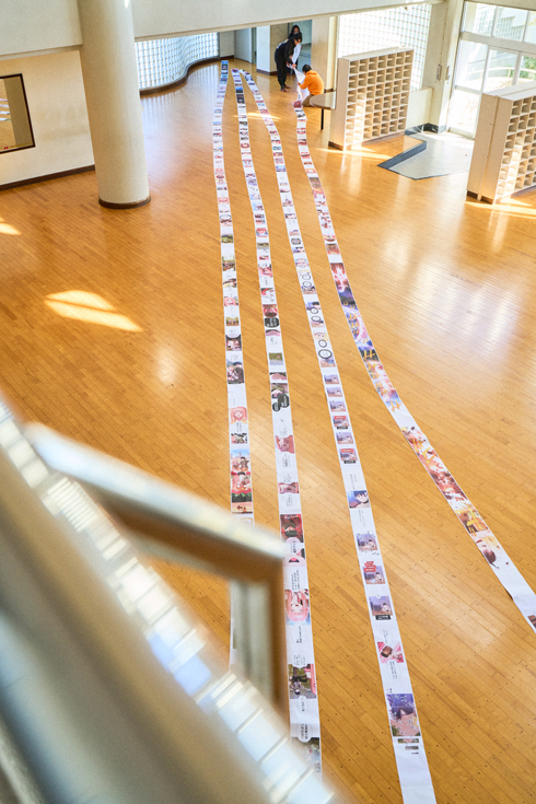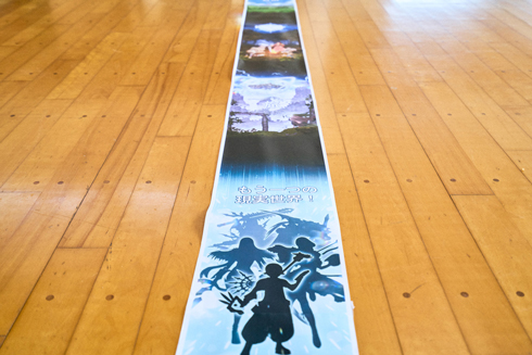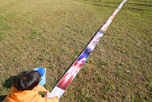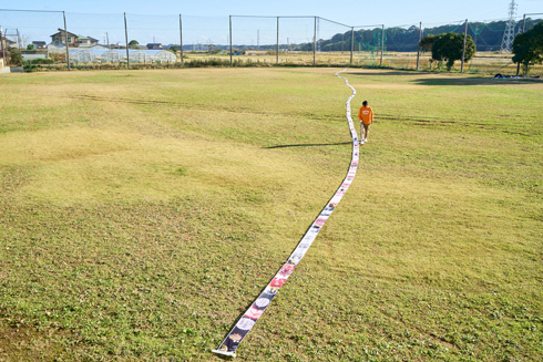 蛇行しているのは許してほしい。長すぎて平衡感覚的なものが失われるのだ。それほどの長さがあるということ。よくこんなに紙をつなげたなと驚く。作者の方も長さに驚くと思う。中学校のグランドをほぼ分断する長さだもの。