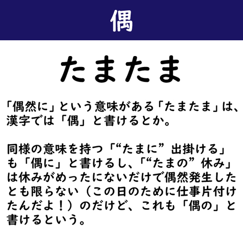 「偶然に」という意味がある「たまたま」は、漢字では「偶」と書けるとか。同様の意味を持つ「“たまに”出掛ける」も「偶に」と書けるし、「“たまの”休み」は休みがめったにないだけで偶然発生したとも限らない(この日のために仕事片付けたんだよ!)のだけど、これも「偶の」と書けるという。