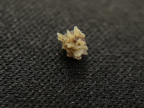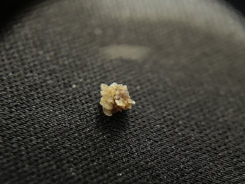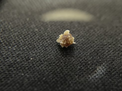 投稿者はシャル(@ilove_tasavalta)さん。自然排石されたというその結石は、大きさ「4〜5ミリぐらい」かつ、まるで金平糖のような形をしています。尿管結石といえば、「三大激痛」の一つにも数えられるほど激しい痛みを伴う病気。その上、こんなに鋭利な形状の結石ができていたとなると、その痛みが想像を絶するものであったことは間違いありません……。