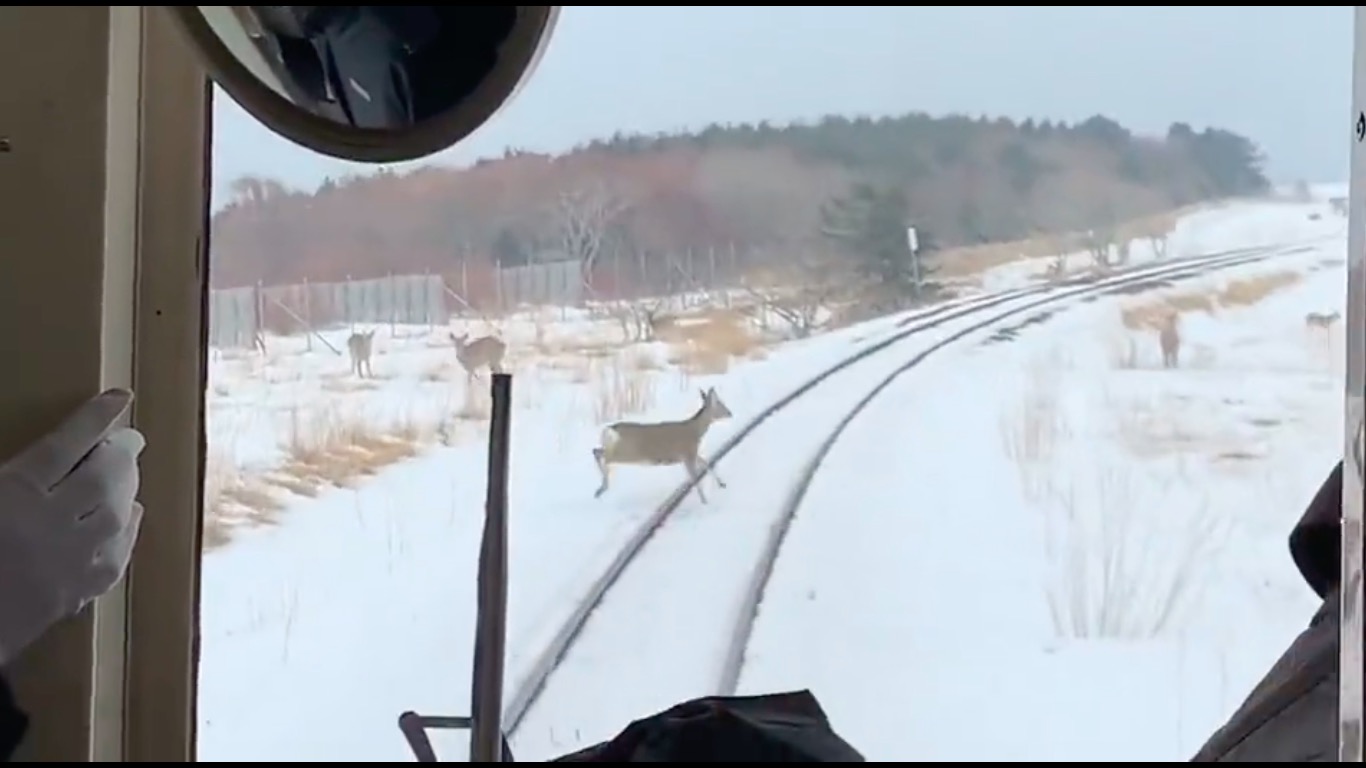 JR北海道・花咲線で撮影された映像。シカがぞろぞろと線路に