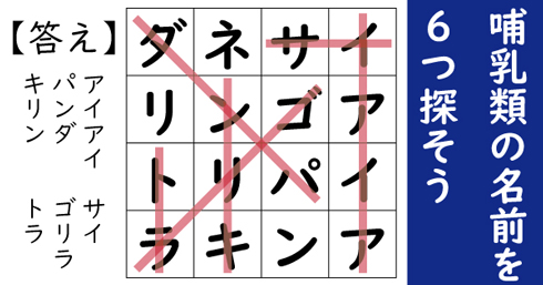 答え:アイアイ、サイ、パンダ、ゴリラ、キリン、トラ