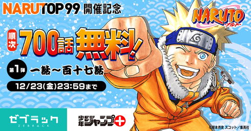 同作公式サイトによると、全世界から参加できる人気キャラクター投票「NARUTOP99」の開催を記念したもので、「ジャンプ+」、集英社の電子書籍サービス「ゼブラック」にて約1カ月半にわたって『NARUTO』全話の無料配信が行われます。また、続編『BORUTO』約40話の無料配信も実施予定。